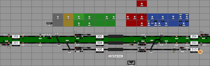 Dispatcher Eastside operates the panel between Wuppertal Hbf (tracks 123,124,133,134) upto Wuppertal-Oberbarmen, including the yellow branch line. Dispatcher Westside operates the panel between Wuppertal-Oberbarmen all to the right side of the panel. A special point on the panel is where the Freight tracks 661 and 662 connect to the station tracks.